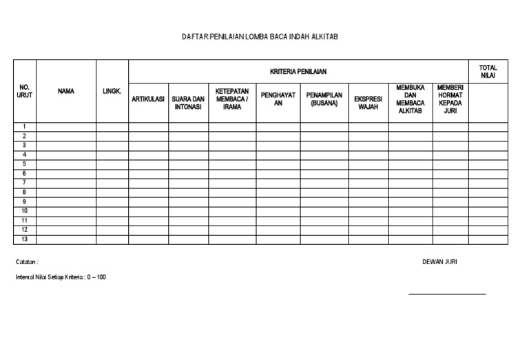 Kriteria Penilaian Baca Indah Alkitab - WebDAFTAR PENILAIAN LOMBA BACA INDAH ALKITAB. TOTAL. KRITERIA PENILAIAN. NILAI. NO. MEMBUKA MEMBERI. NAMA LINGK. KETEPATAN. URUT PENGHAYAT PENAMPILAN DAN HORMAT. WebAspek penilaian lomba baca Kitab Suci. Aspek-aspek penilaian lomba Baca Kitab Suci meliputi: Pembuka dan penutup bacaan: Formulasi kalimat yang diucapkan.
